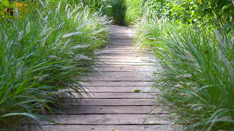 Materialien für den Gartenweg: Stein, Rindenmulch oder Holzbalken?