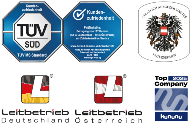 2015 wurde der FirmenABC Marketing GmbH vom Bundesministerium für Wissenschaft, Forschung und Wirtschaft das Staatswappen der Republik Österreich verliehen. 2018 wurden wir mit den Servicesiegeln Leitbetrieb Deutschland und Leitbetrieb Österreich ausgezeichnet. Besonders stolz sind wir auf die erst kürzlich erfolgreich bestandene Prüfung durch die TÜV SÜD Management Service GmbH. Außerdem tragen wir das Top-Company-Siegel von kununu.